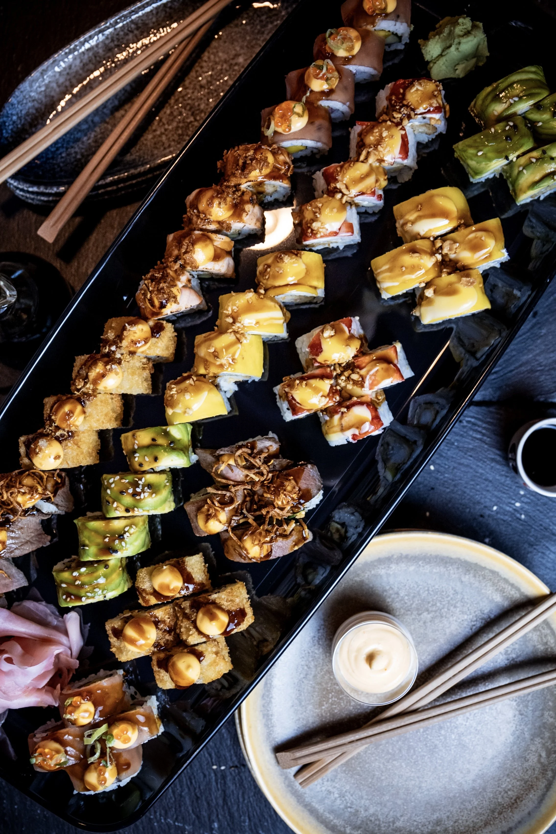 Sushi: Jordbær, Golden Dragon og Deluxe Tiger maki.